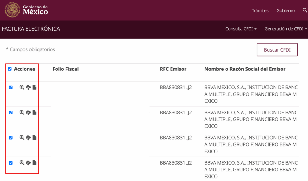 Si necesitas descargar varios CFDI, puedes seleccionarlos y generar tu descarga.