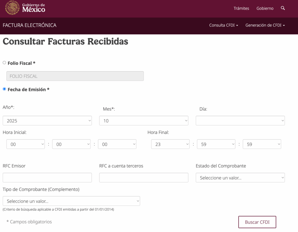 Puedes buscar por folio fiscal (UUID) si necesitas un CFDI específico, o utilizar filtros por fecha para consultar periodos completos.